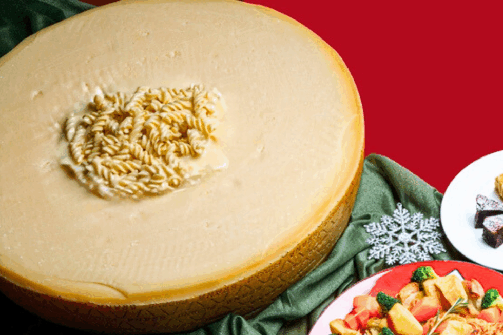 ◆クリスマスマーケットフェアの主役、巨大パルメザンチーズで作るクリームパスタ。濃厚で滑らかな味わいが特徴で、冬の贅沢なひとときを彩ります。