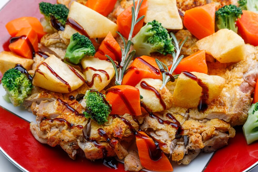 ◆じっくり焼き上げた鶏もも肉に、芳醇なバルサミコソースをかけて。柔らかくジューシーな食感をお楽しみください。
