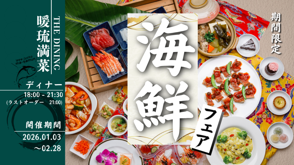 | 内 容 | 琉球郷土料理と和洋中創作ブッフェ「祝 新年 海鮮グルメフェア」 大人¥5,300、小学生¥2,500、幼児(4-5歳)¥1,200、3歳以下無料 気になるメニューはこちらから 〉〉 |