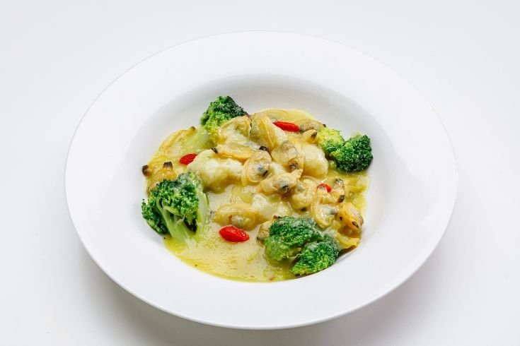 彩り野菜のアサリうっちんクリームあんかけ