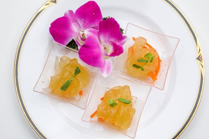 ◆クラゲの食感と紅白なますのさっぱり感に、沖縄産タンカンの爽やかな香りを添えた、前菜にぴったりの一品。